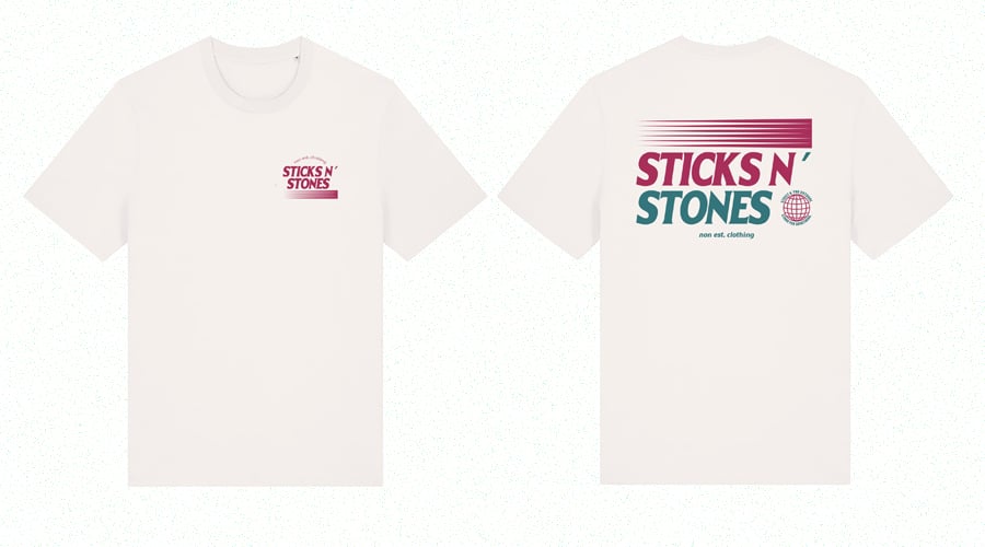 Das T-Shirt kommt in einem cleanen Off-White-Ton, veredelt mit einem kleinen Frontprint auf der Brust und einem markanten, großflächigen Backprint. Der grafische Print mixt kräftiges Pink mit sattem Petrolgrün.